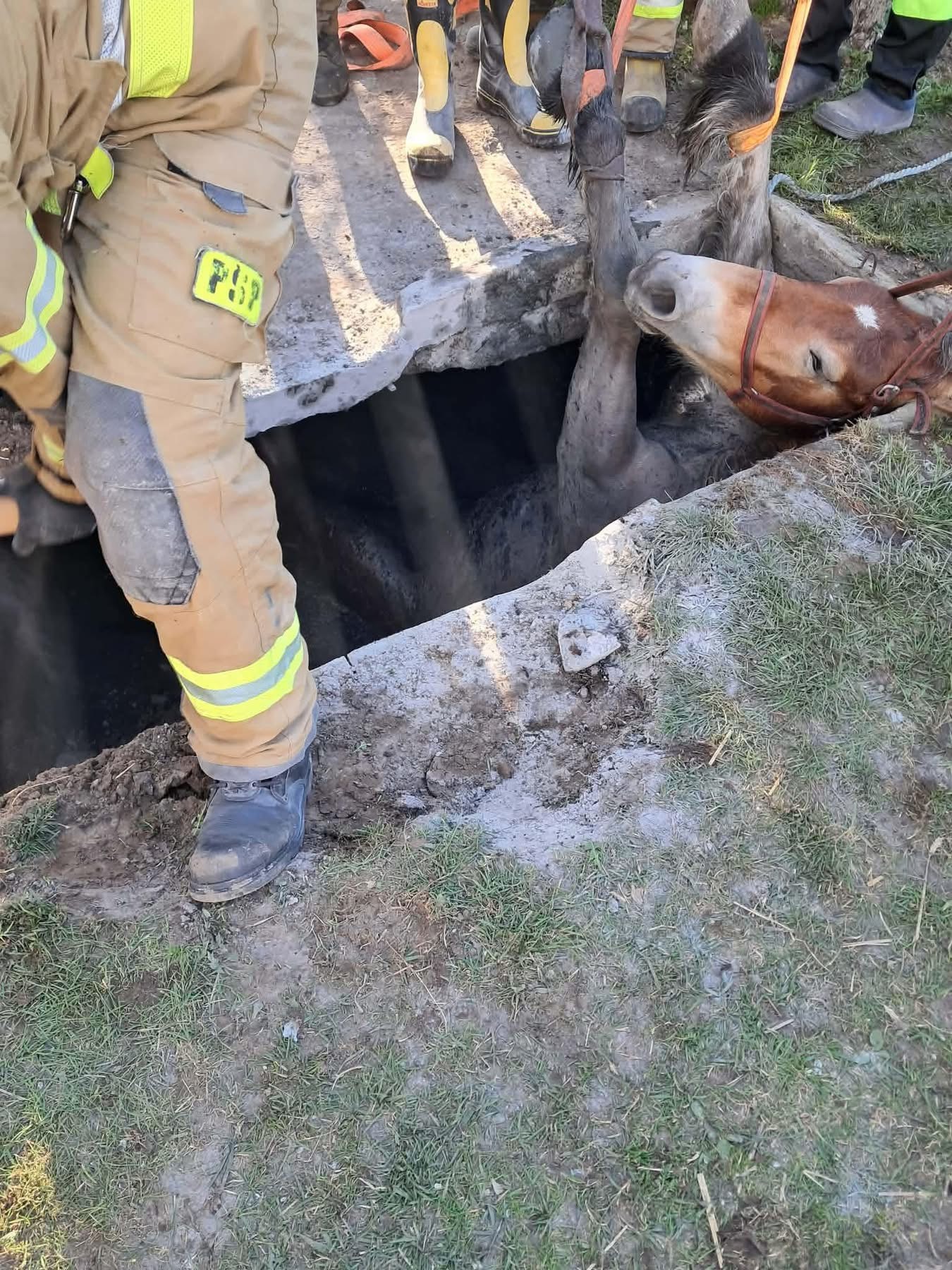 Interwencja służb związana z nietypowym zdarzeniem – koń wpadł do zbiornika na nieczystości i nie był w stanie samodzielnie się wydostać. Na miejsce natychmiast zadysponowano jednostki straży pożarnej, które podjęły działania ratownicze, aby bezpiecznie uwolnić zwierzę.
